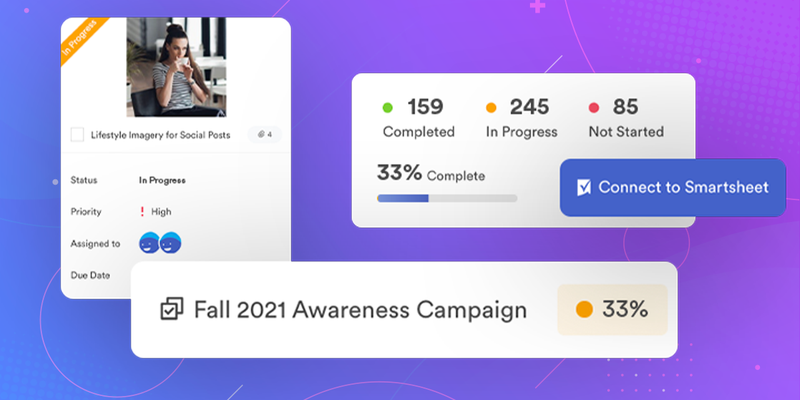 Integrate with Smartsheet– A Forrester Wave leading Collaborative Work Management tool – to level up your marketing and creative production with powerful automations, reporting and workflow capabilities. Keep your creatives in DAM and their creative tools without interruption, while allowing them to connect with and participate in the overall business operations your company manages in Smartsheet. This allows teams to better track budgets, manage resources, and report on KPIs in the context of larger business initiatives.